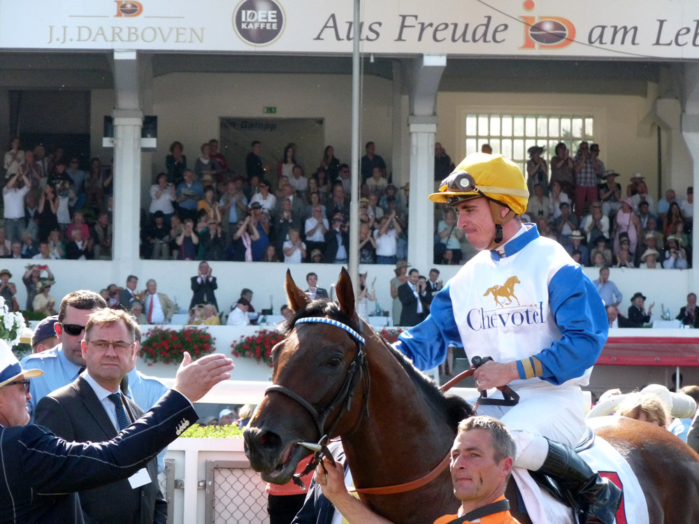 Bermuda Reef sieht zwar gut aus, ist aber entweder nur spät oder doch Blender. Positiv hervorzuheben sind noch Global Bang, der immer ein wenig irre aussieht, der aber ein toller Typ ist, Très Blue, der sehr gelassene und noch völlig trockene Lucky Speed natürlich und auch Limario und Nicolosio. Letzterer ist allerdings eine Nummer kleiner geraten. Das Derby selbst sahen wir wie in jedem Jahr vor der Leinwand stehend. Immer wieder toll, wenn eingangs der Geraden alle lautstark ihre Favoriten anfeuern! Und es wurde ein durchaus spannendes Derby. Was hatten wir am Samstag geunkt, dass von hinten nichts kommen würde, doch am Sonntag ging diese Taktik im Gegensatz zu den Tagen zuvor, gleich mehrfach auf. So auch im Rennen der Rennen. Lucky Speed machte seinem Namen wie in München schon alle Ehre und zog auf den letzten Metern unwiderstehlich an. Auch wenn es am Ende nur eine ¾ Länge Vorsprung auf Trés Blue war, konnte man doch auf den letzten 150 Metern deutlich sehen, dass weder innen noch außen einer an Lucky Speed vorbeikommen würde. Und so wird das Derby 2013 als der sechste Derbysieg für Andrasch Starke, als der vierte für Peter Schiergen und der erste für Stall Hornoldendorf in die Galoppsportannalen eingehen. Und auch wenn Jockey und Trainer das Gefühl des Derbysieges nicht zum ersten Mal genossen, konnte man allen Beteiligten die große Freude deutlich anmerken. Auch Roland Dzubasz, der mit dem krassen Außenseiter Nordvulkan den drittplatzierten stellte, strahlte natürlich. Head to Head: 5 (Ivanhowe) – 3 (Très Blue)
